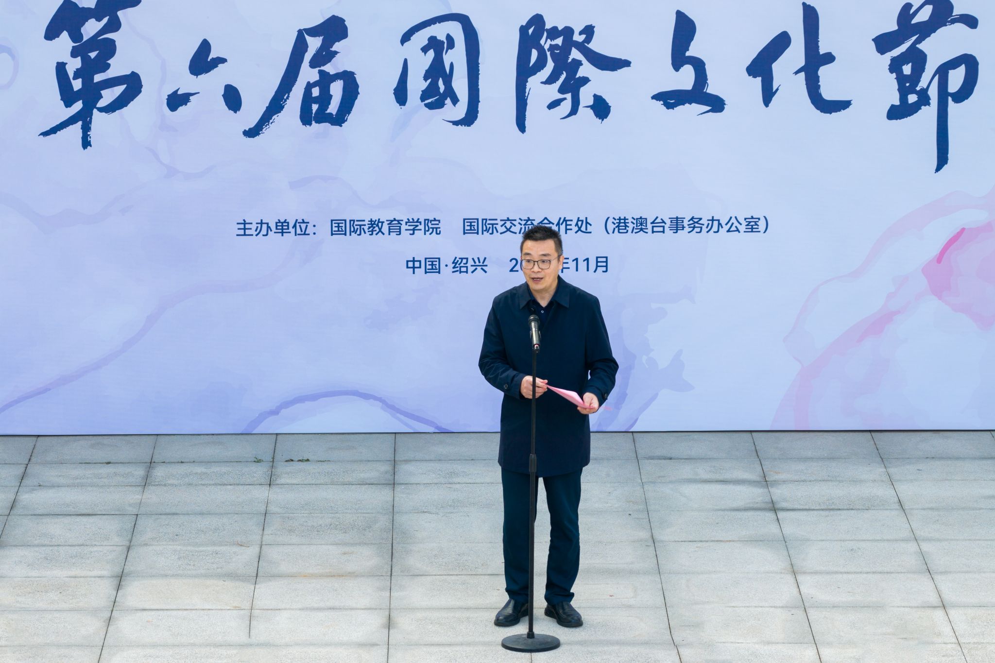 副校长胡云进出席启动仪式并致辞。绍兴市公安局出入境管理支队支队长钱绍春、越城区公安分局塔山派出所副所长季倍森、绍兴市文化广电旅游局博物馆处处长、绍兴博物馆馆长何鸣雷、绍兴科技馆馆长陶思敏、越城区文广旅游局党组成员、浙东运河博物馆馆长张慧、学校相关职能部处、二级学院留学生工作负责人出席本次国际文化节启动仪式。启动仪式由国际教育学院院长俞国芬主持。